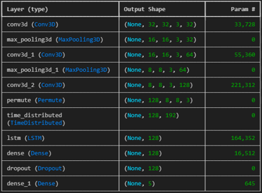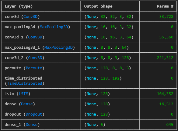 Model 2: The second variation is a 3D CNN + Transformer encoder to try and detect the same sequences. It once again uses 3 convolutional layers with max pooling, with two transformer blocks with 4 attention heads, a dense layer, and dropout.